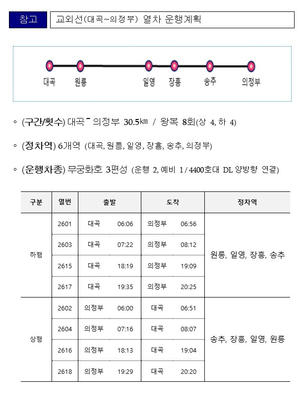 ’04년 왕복 6회 운행했던 교외선은 ’25년 1월 11일(토)부터 대곡역, 원릉역, 일영역, 장흥역, 송추역, 의정부역 등 6개 역에 무궁화호 열차를 왕복 8회* 운행할 계획이다. 대곡에서 의정부까지 약 50분 가량 소요된다.