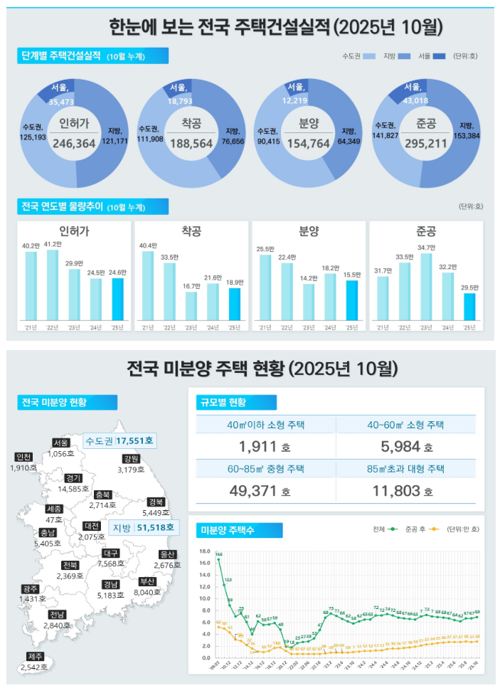 착공 실적은 감소세가 두드러졌다. 수도권 10월 착공은 1만108호로 전년 동월(1만2,894호) 대비 21.6% 감소했고, 누적 착공 역시 11만1,908호로 8.5% 줄었다. 다만 서울은 10월 착공이 2,851호로 전년보다 177.3% 급증했고, 누적 착공도 1만8,793호로 1.2% 증가했다. 비수도권 착공은 10월 7,669호로 25.6% 감소, 누적 기준 7만6,656호로 17.9% 줄었다.