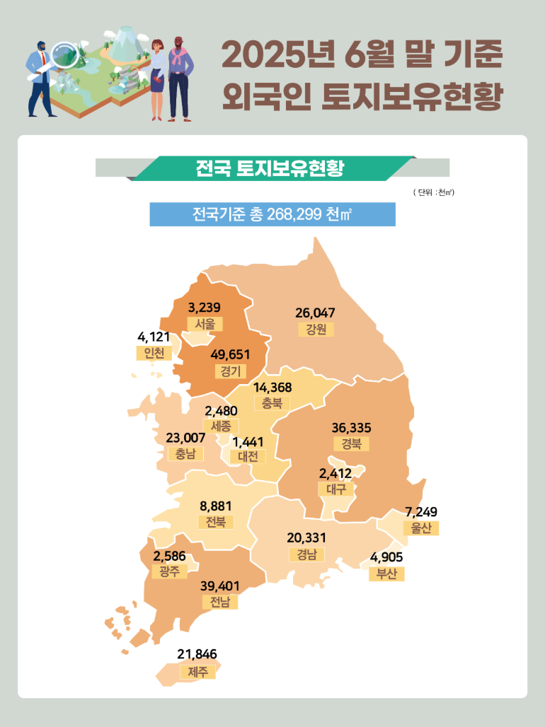 - (토지) 외국인 보유토지 268,299천㎡, 전 국토의 0.27%